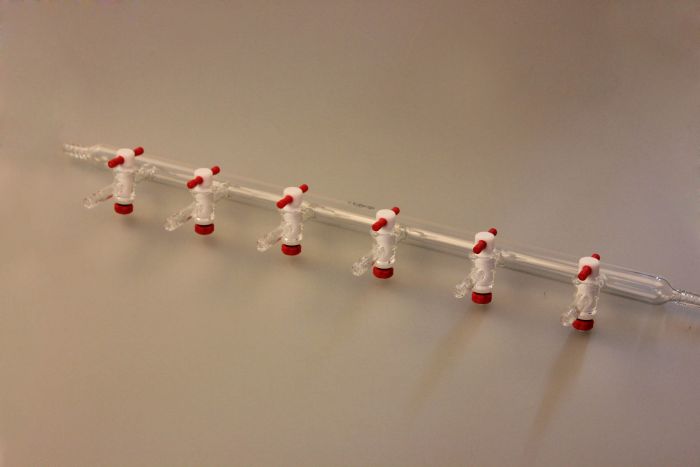 多肽合成双排管,19/22口,8组,总宽710mm,后排横梁左侧为四节小咀,前排横梁右侧为2mm四氟节门。 N411908